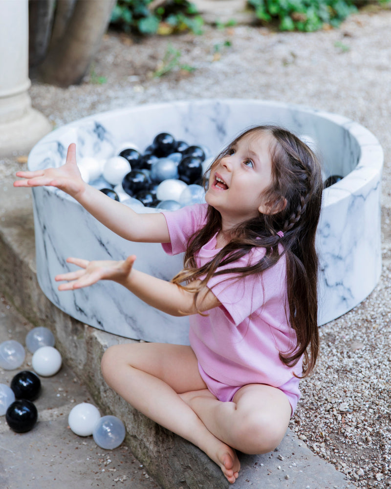 Our Larisa & Pumpkin Marble Ball Pit with Silver/Pearl/Black Balls is guaranteed to keep little ones entertained for hours, containing 200 CE certified balls that are made of non-toxic, azo dye-free plastic. Ball pits are not only great for fun but are also ideal for developing your baby’s gross and fine motor skills.