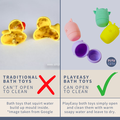 Unlike traditional bath toys, these open easily to prevent mould buildup. Simply wash with warm, soapy water after use and let them air dry. Certified to meet EU and UK safety standards, these toys are ready for safe and engaging play.